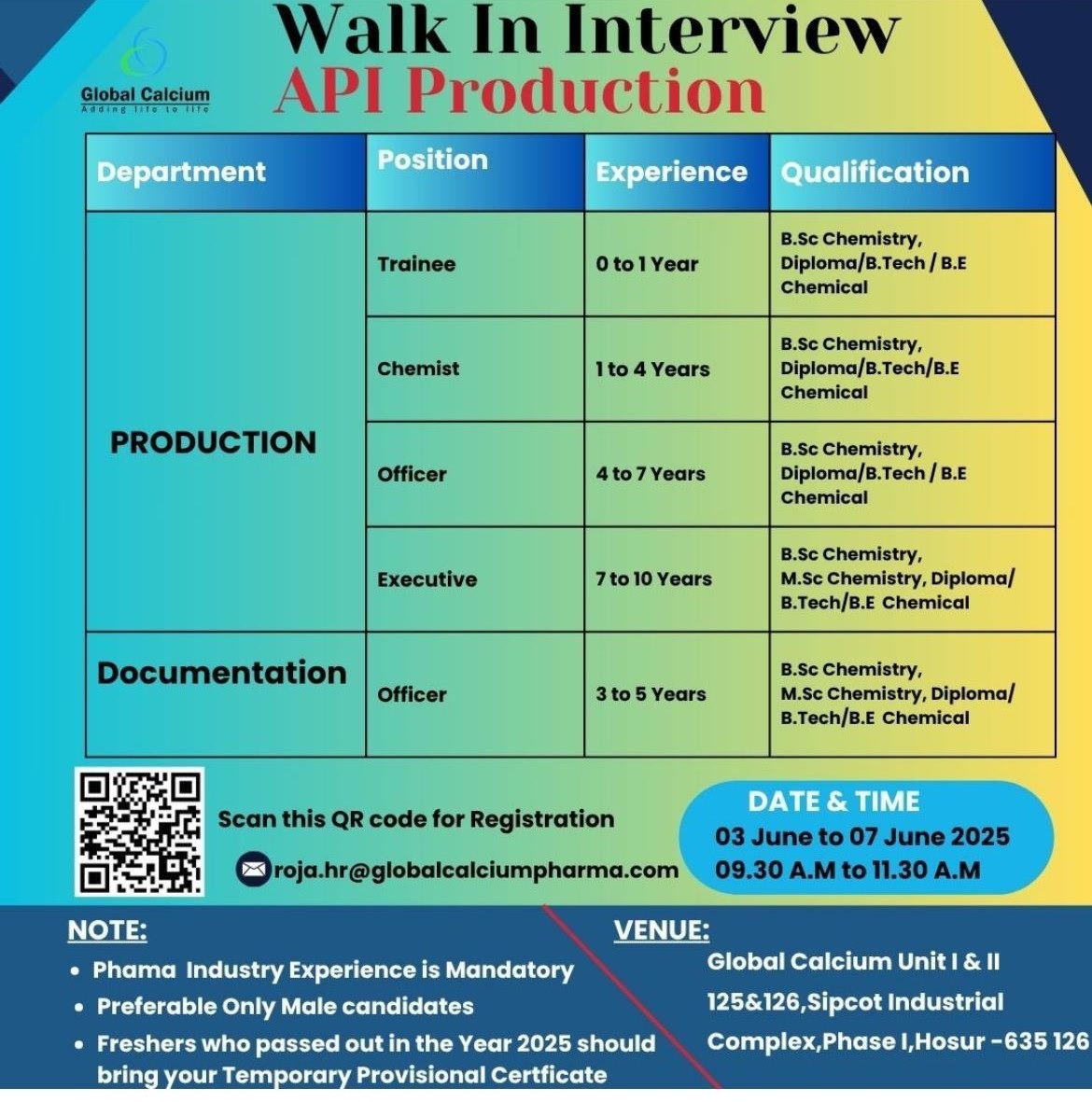 Global Calcium- Walk In Interview API Production on 03rd to 07th June 2025 Global Calcium- Walk In Interview API Production on 03rd to 07th June 2025 Post Views: 826 Job Category: Pharma Job Type: Full Time Job Location: Hosur Apply for this position Full Name *Email *Phone *Cover Letter *Upload CV/Resume *Allowed Type(s): .pdf, .doc, .docxBy using this form you agree with the storage and handling of your data by this website. *