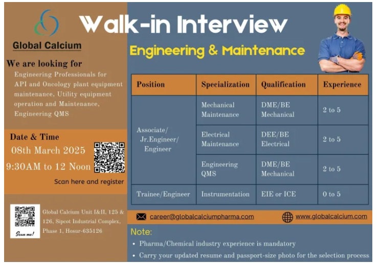 . Interview Location: Global Calcium, 125 & 126, Unit I & II, Sipcot Industrial Complex, Hosur, Tamil Nadu – 635126