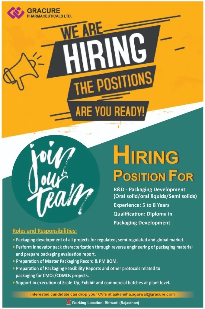 Gracure Pharmaceuticals- Hiring for R&D-Packaging Development Apply Now