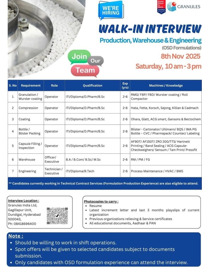Granules India-Interview for D.Pharm, M.Sc, B.Sc in Production, Warehouse& Engineering on 8th November 2025,