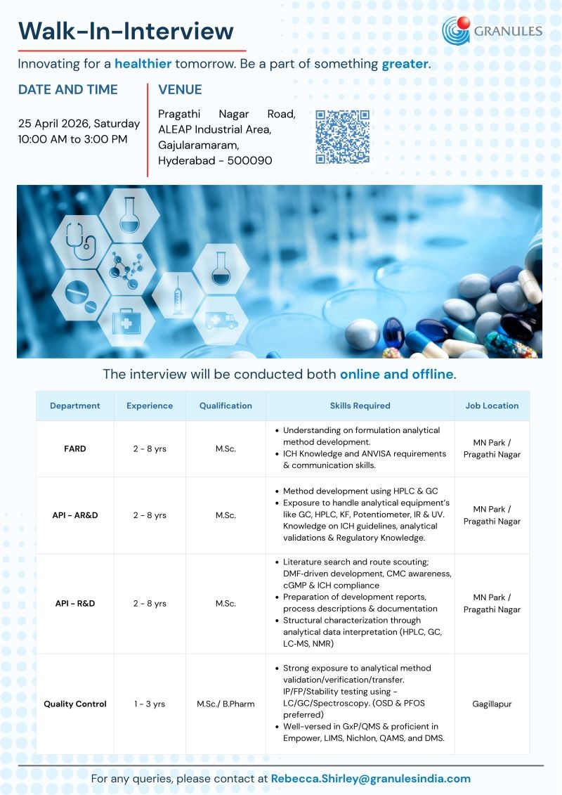 Granules India is a vertically integrated, high-growth pharmaceutical company with 38 years of proven performance and increasing performance and increasing presence across the world. Headquartered in Hyderabad, India, Granules offers collaborative and strategic partnership to global pharmaceutical leaders by producing best quality API, PFI and FD through manufacturing excellence, process innovation and regulatory expertise.