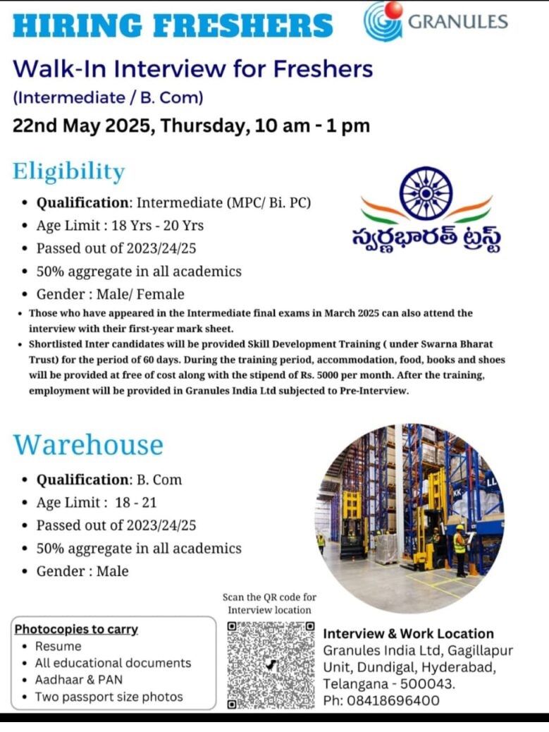 Granules India Ltd- Walk-In Interview for Freshers on 22nd May 2025 @Hyderabad Granules India Ltd- Walk-In Interview for Freshers on 22nd May 2025 @Hyderabad Post Views: 702 Apply for this position Full Name *Email *Phone *Cover Letter *Upload CV/Resume *Allowed Type(s): .pdf, .doc, .docxBy using this form you agree with the storage and handling of your data by this website. *
