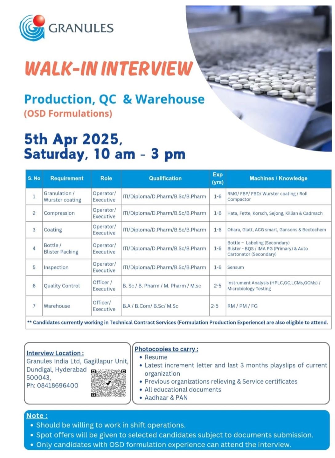 Granules India- Walk In Interview For Production/ QC & Warehouse on 5th April 2025, Granules India- Walk In Interview For Production/ QC & Warehouse on 5th April 2025, Post Views: 1,207 Job Category: Pharma Job Type: Full Time Job Location: , Dundigal Apply for this position Full Name *Email *Phone *Cover Letter *Upload CV/Resume *Allowed Type(s): .pdf, .doc, .docxBy using this form you agree with the storage and handling of your data by this website. *