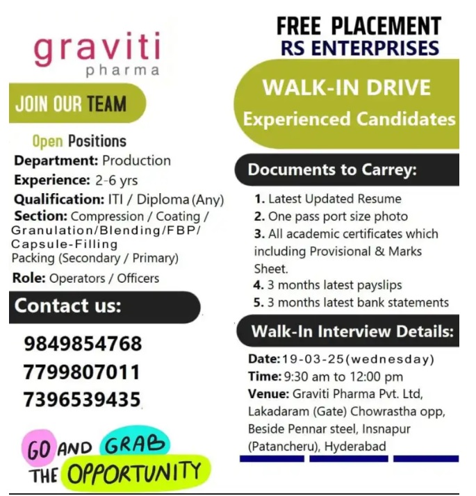 Date: 19-03-25 (wednesday) Time: 9:30 am to 12:00 pm Venue: Graviti Pharma Pvt. Ltd, Lakadaram (Gate) Chowrastha opp, Beside Pennar steel, Insnapur (Patancheru), Hyderabad
