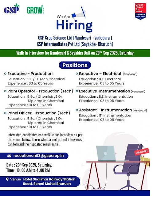 GSP Cropscience- Walk In Interview For Production/ DCS/ Electrical/ Instrumentation on 20th Sep 2025