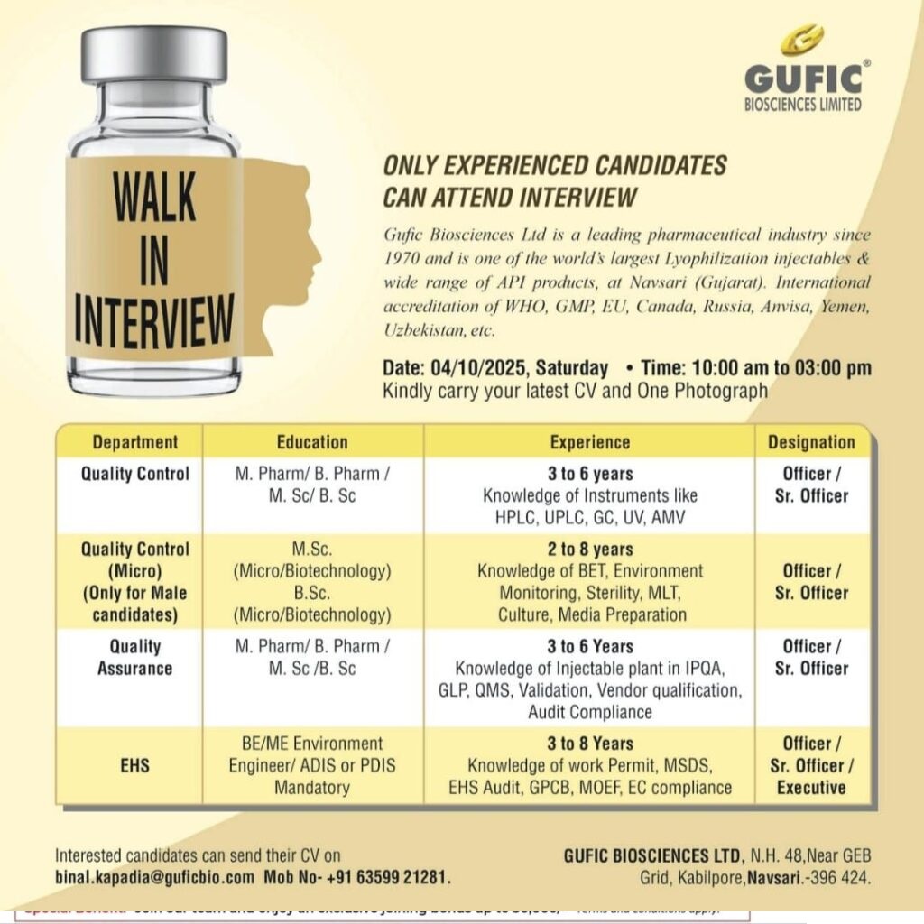 Gufic Biosciences- Walk-In Interview for QC, QA & EHS on 04 October 2025@ Navsari Gufic Biosciences- Walk-In Interview for QC, QA & EHS on 04 October 2025@ Navsari Post Views: 973 Job Category: Pharma Job Type: Full Time Job Location: Navsari (Gujarat). Apply for this position Full Name *Email *Phone *Cover Letter *Upload CV/Resume *Allowed Type(s): .pdf, .doc, .docxBy using this form you agree with the storage and handling of your data by this website. *