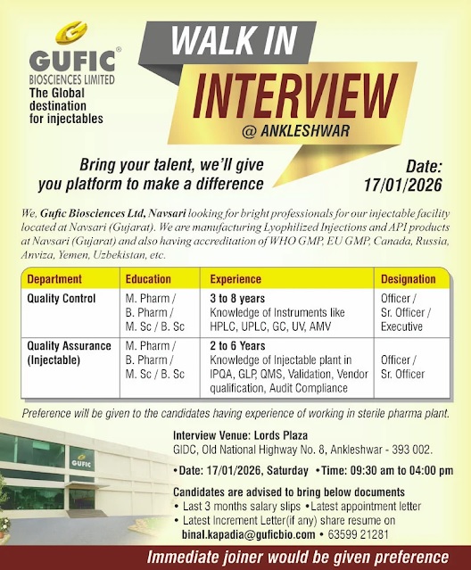 GUFIC Biosciences- Walk-In Interview for QC & QA Injectable on 17 Jan 2026 @Ankleshwar – Gujarat