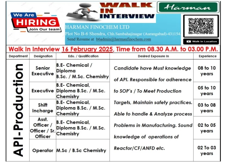 HARMAN FINOCHEM LTD-Walk-In Interview for our API manufacturing@, Aurangabad MS. On Sunday, 16th Feb 25