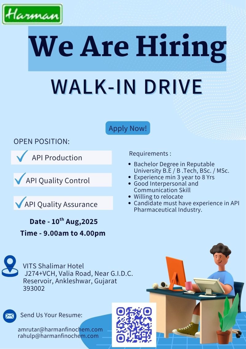 Harman- Walk In Interview For Production, QC & QA (API) on 10th August 2025 Harman- Walk In Interview For Production, QC & QA (API) on 10th August 2025 Post Views: 320 Job Category: Pharma Job Type: Full Time Job Location: Gujarat Apply for this position Full Name *Email *Phone *Cover Letter *Upload CV/Resume *Allowed Type(s): .pdf, .doc, .docxBy using this form you agree with the storage and handling of your data by this website. *