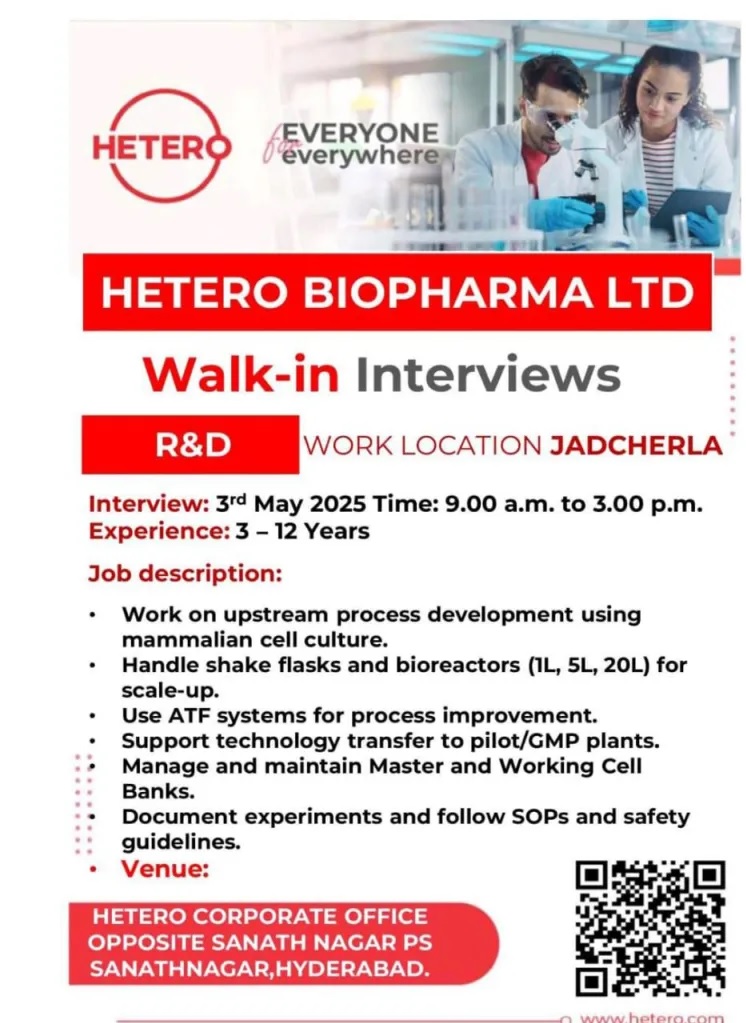 Hetero Biopharma-Walk-In Interview for R&D Team on 3rd May 2025 Hetero Biopharma-Walk-In Interview for R&D Team on 3rd May 2025 Post Views: 697 Job Category: Pharma Job Type: Full Time Job Location: Jadcherala Apply for this position Full Name *Email *Phone *Cover Letter *Upload CV/Resume *Allowed Type(s): .pdf, .doc, .docxBy using this form you agree with the storage and handling of your data by this website. *
