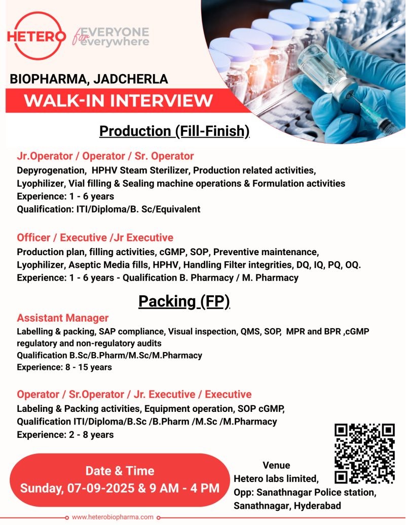 Hetero Biopharma- Walk In Interview For Production and Packing on 07-09-2025 Hetero Biopharma- Walk In Interview For Production and Packing on 07-09-2025 Post Views: 288 Job Category: Pharma Job Type: Full Time Job Location: Hyderabad Apply for this position Full Name *Email *Phone *Cover Letter *Upload CV/Resume *Allowed Type(s): .pdf, .doc, .docxBy using this form you agree with the storage and handling of your data by this website. *