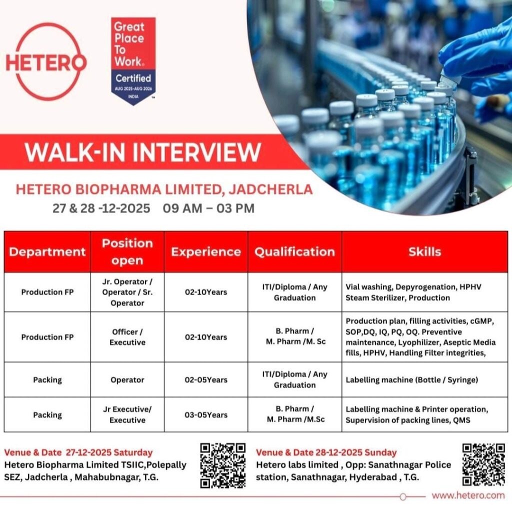 Hetero Biopharma -Walk-In Interview for Production & Packing on 27 & 28 December 2025 @ Jadcherla Hetero Biopharma -Walk-In Interview for Production & Packing on 27 & 28 December 2025 @ Jadcherla Post Views: 211 Job Category: Pharma Job Type: Full Time Job Location: Hyderabad Apply for this position Full Name *Email *Phone *Cover Letter *Upload CV/Resume *Allowed Type(s): .pdf, .doc, .docxBy using this form you agree with the storage and handling of your data by this website. *