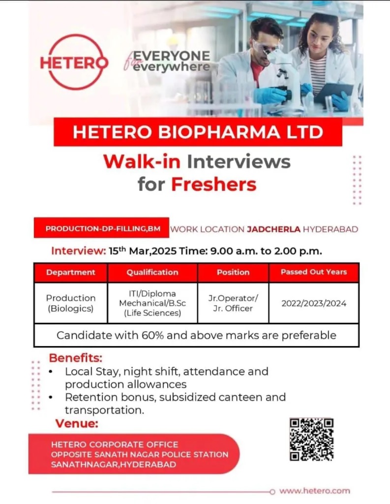 Hetero Biopharma- Walk-In Interview for Freshers Production Dept on 15 March 2025 Hetero Biopharma- Walk-In Interview for Freshers Production Dept on 15 March 2025 Post Views: 925 Job Category: Pharma Job Type: Full Time Job Location: SANATHNAGAR Apply for this position Full Name *Email *Phone *Cover Letter *Upload CV/Resume *Allowed Type(s): .pdf, .doc, .docxBy using this form you agree with the storage and handling of your data by this website. *