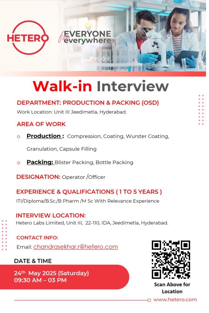 Hetero Labs- Walk-in Interview Production & Packing (OSD) Operator/Officer on 24th May 2025@Hyderabad Hetero Labs- Walk-in Interview Production & Packing (OSD) Operator/Officer on 24th May 2025@Hyderabad Post Views: 986 Job Category: Pharma Job Type: Full Time Job Location: Hyderabad Apply for this position Full Name *Email *Phone *Cover Letter *Upload CV/Resume *Allowed Type(s): .pdf, .doc, .docxBy using this form you agree with the storage and handling of your data by this website. *