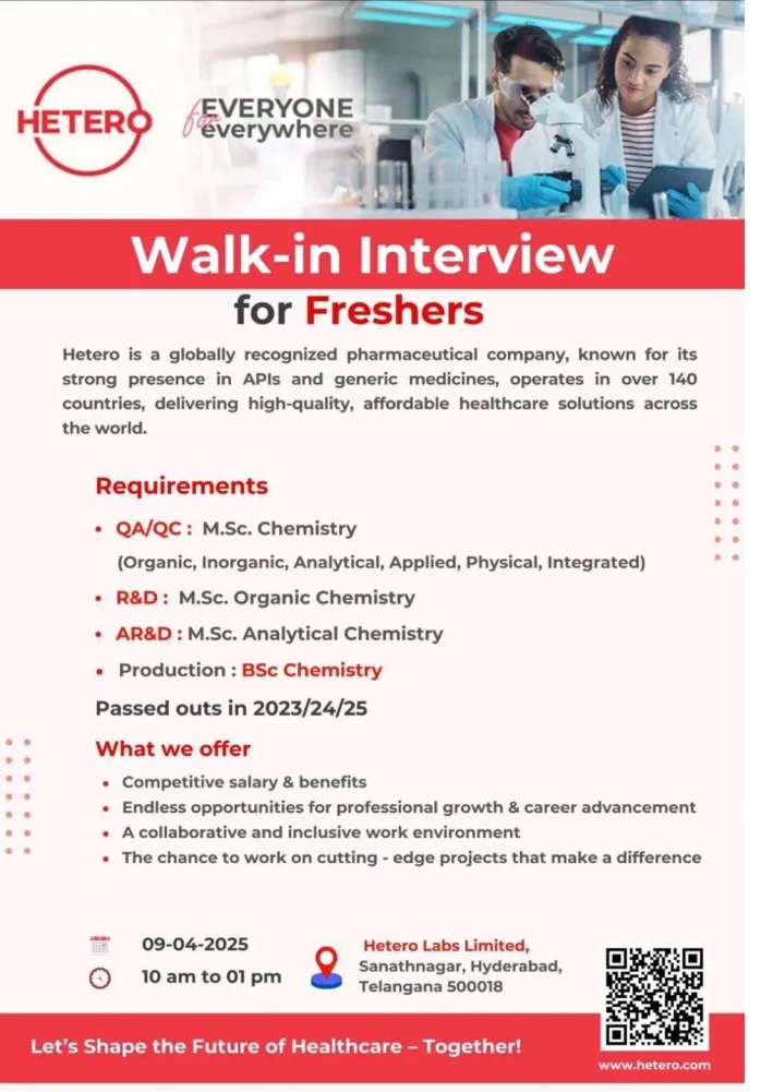 Hetero Labs- Walk-In Interview for Freshers QC, QA, R&D, Production on 9 April 2025 Hetero Labs- Walk-In Interview for Freshers QC, QA, R&D, Production on 9 April 2025 Post Views: 727 Job Category: Pharma Job Type: Full Time Job Location: Hyderabad SANATHNAGAR Apply for this position Full Name *Email *Phone *Cover Letter *Upload CV/Resume *Allowed Type(s): .pdf, .doc, .docxBy using this form you agree with the storage and handling of your data by this website. *