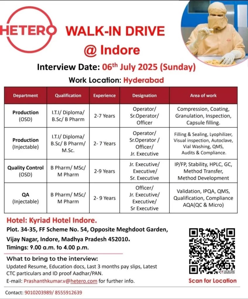 Hetero, a leading pharmaceutical company, is organizing a walk-in drive in Indore on 6th July 2025 (Sunday). The recruitment event will be held at Kyriad Hotel Indore, located at Plot 34-35, FF Scheme No. 54, Opposite Meghdoot Garden, Vijay Nagar, Indore, Madhya Pradesh 452010. The interviews will take place from 9:00 a.m. to 4:00 p.m. The selected candidates will be placed at Hetero’s Hyderabad location.