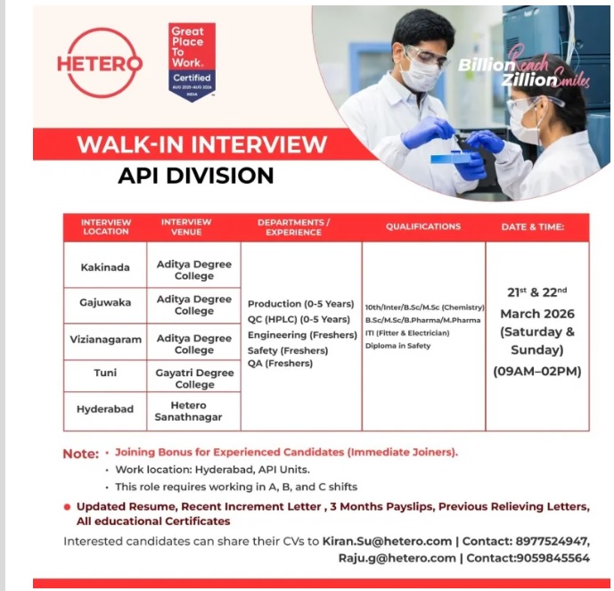 HETERO – Walk-In For Freshers & Experienced In Production / QC/QA/Safety / Engineering On 21st & 22nd Mar 2026 HETERO – Walk-In For Freshers & Experienced In Production / QC/QA/Safety / Engineering On 21st & 22nd Mar 2026 Post Views: 5 Job Category: Pharma Job Type: Full Time Job Location: Hyderabad Apply for this position Full Name *Email *Phone *Cover Letter *Upload CV/Resume *Allowed Type(s): .pdf, .doc, .docxBy using this form you agree with the storage and handling of your data by this website. *