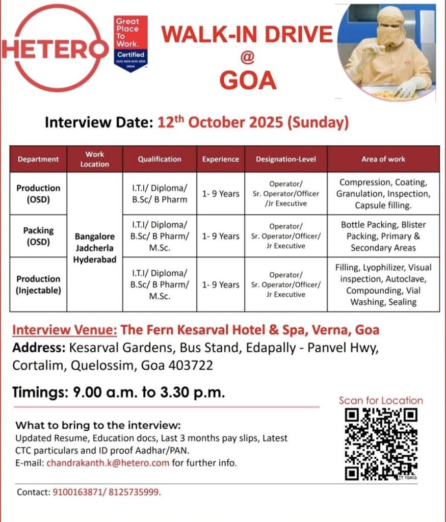 Hetero- Walk-In Drive for Production & Packing  on 12th Oct 2025@ Goa