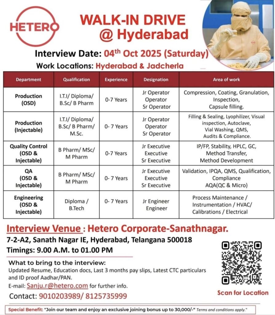 HETERO-Walk-In Drive Production, QC, QA & Engineering on 04th Oct 2025@ Hyderabad HETERO-Walk-In Drive Production, QC, QA & Engineering on 04th Oct 2025@ Hyderabad Post Views: 339 Job Category: Pharma Job Type: Full Time Job Location: Hyderabad Jadcherala Apply for this position Full Name *Email *Phone *Cover Letter *Upload CV/Resume *Allowed Type(s): .pdf, .doc, .docxBy using this form you agree with the storage and handling of your data by this website. *