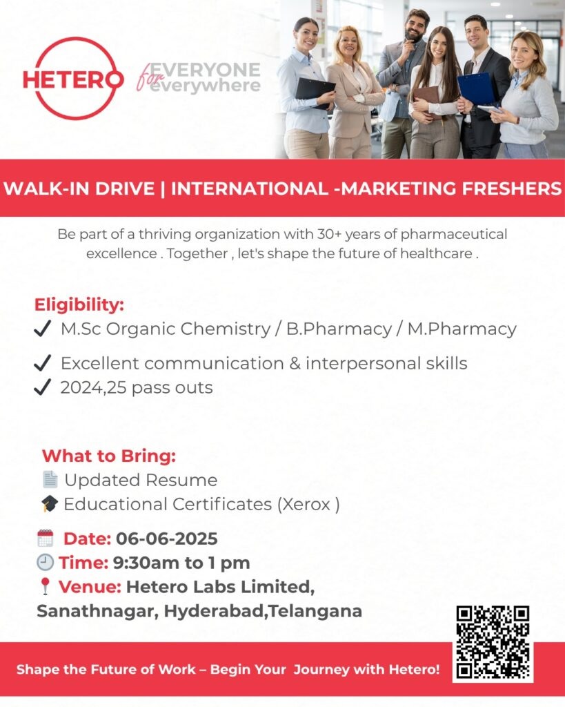 Hetero -Walk-In Drive for International Marketing Freshers on 6th June 2025 Hetero -Walk-In Drive for International Marketing Freshers on 6th June 2025 Post Views: 421 Job Category: Pharma Job Type: Full Time Job Location: Hyderabad Apply for this position Full Name *Email *Phone *Cover Letter *Upload CV/Resume *Allowed Type(s): .pdf, .doc, .docxBy using this form you agree with the storage and handling of your data by this website. *