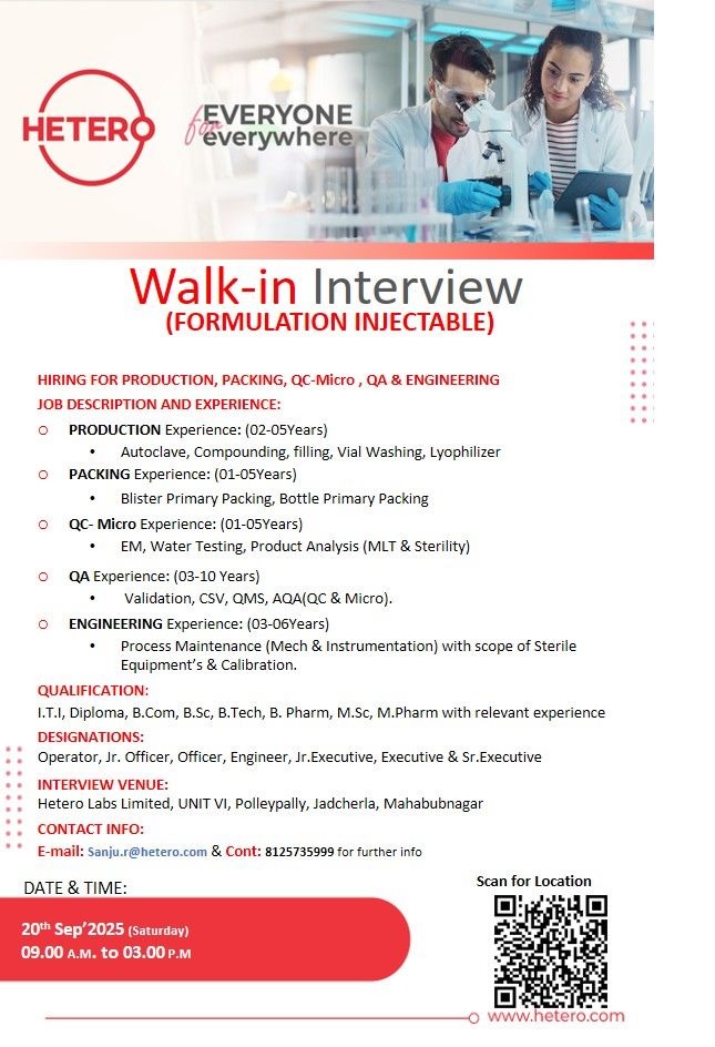 Hetero -Walk In Interview For Production/ Packing/ QC/ QA and Engineering on 20th Sep 2025