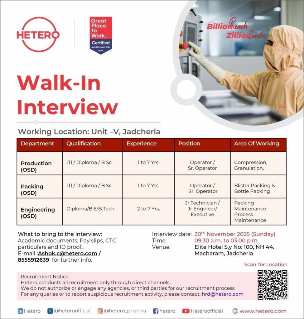 Hetero- Walk-In Interview for Production, Packing, & Engineering on 30th November 2025 @Jadcherla Unit – V
