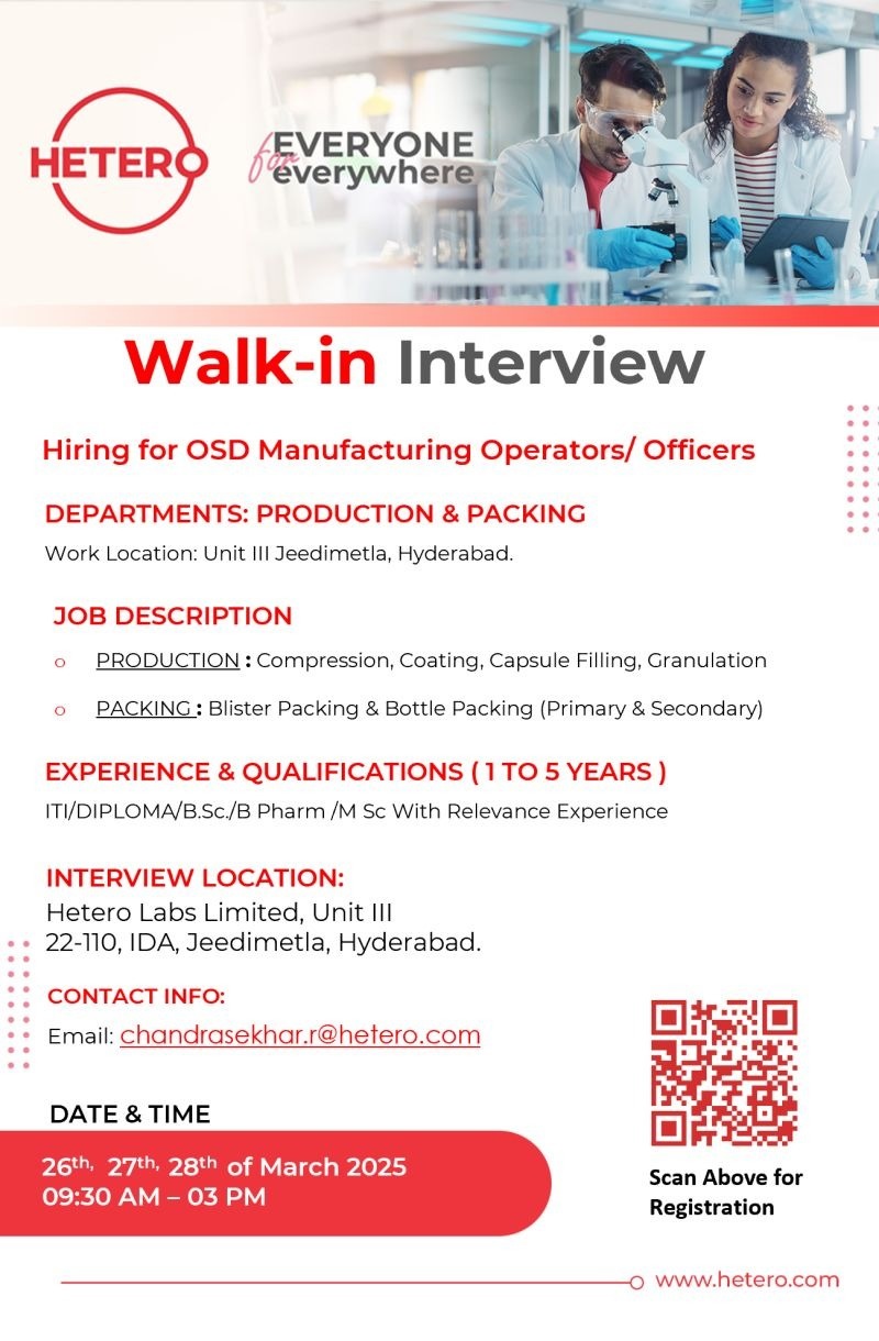 Hetero -Walk In Interview For Production and Packing on 26th, 27th, 28th of March 2025 Hetero -Walk In Interview For Production and Packing on 26th, 27th, 28th of March 2025 Post Views: 769 Job Category: Pharma Job Type: Full Time Job Location: Hyderabad Apply for this position Full Name *Email *Phone *Cover Letter *Upload CV/Resume *Allowed Type(s): .pdf, .doc, .docxBy using this form you agree with the storage and handling of your data by this website. *