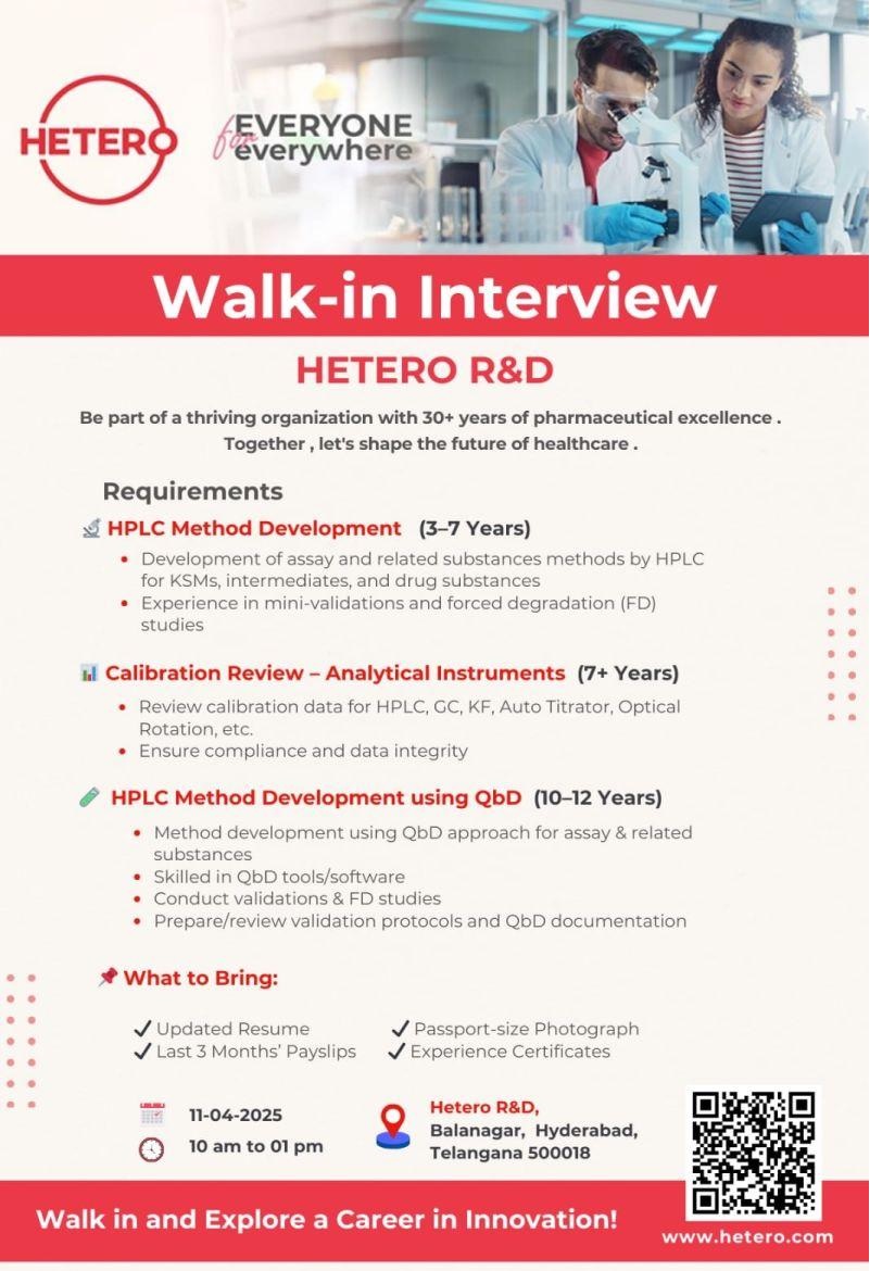 Hetero -Walk In Interview For R&D Professionals on 11-04-2025 Hetero -Walk In Interview For R&D Professionals on 11-04-2025 Post Views: 1,018 Job Category: Pharma Job Type: Full Time Job Location: Hyderabad Apply for this position Full Name *Email *Phone *Cover Letter *Upload CV/Resume *Allowed Type(s): .pdf, .doc, .docxBy using this form you agree with the storage and handling of your data by this website. *
