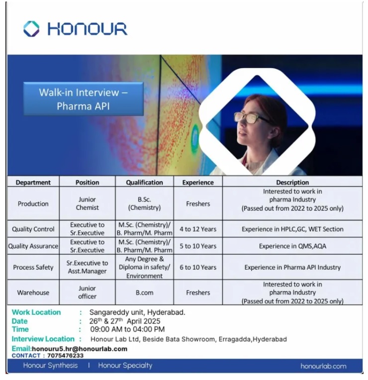 Honour Lab Limited is Established in the year 2010, in Erragadda, Hyderabad is a top player in the category Pharmaceutical Manufacturers in the Hyderabad. We are conducting walk-in interviews for Sangareddy Plant. We are Hiring Production / QA/ QC/Process Safety / Warehouse Candidates for Units located at Sangareddy on 26th & 27th April-2025, 9:00 AM to 04:00 PM at Hyderabad.