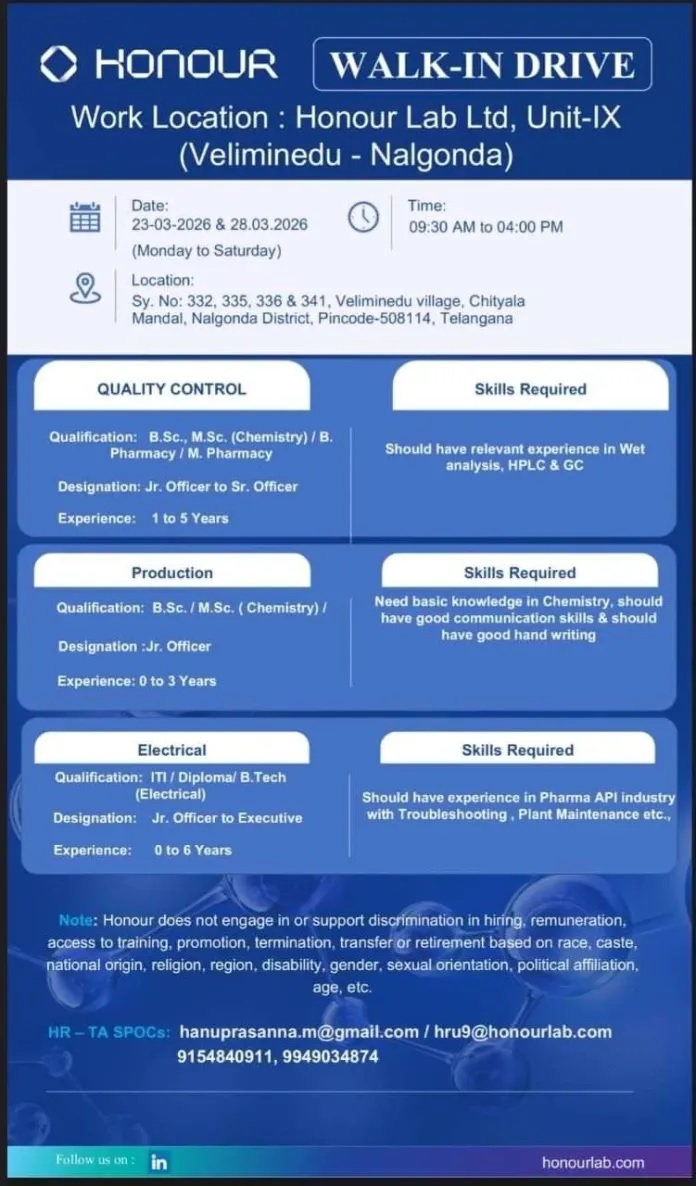 Honour Lab -Walk in for Quality Control, Production on 23rd & 28.03.2026