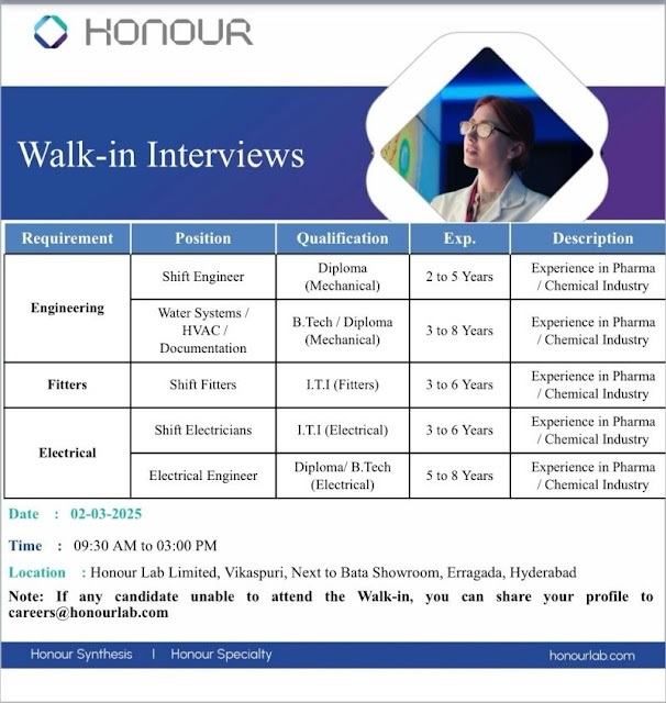 Honour- Walk In Interview For Engineering Dept on 02-03-2025 Honour- Walk In Interview For Engineering Dept on 02-03-2025 Post Views: 1,145 Job Category: Pharma Job Type: Full Time Job Location: Hyderabad Apply for this position Full Name *Email *Phone *Cover Letter *Upload CV/Resume *Allowed Type(s): .pdf, .doc, .docxBy using this form you agree with the storage and handling of your data by this website. *