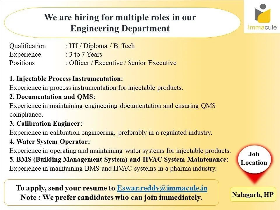 Immacule- Hiring for multiple roles in Engineering Department Immacule- Hiring for multiple roles in Engineering Department Post Views: 583 Job Category: Pharma Job Type: Full Time Job Location: Nalagarh Apply for this position Full Name *Email *Phone *Cover Letter *Upload CV/Resume *Allowed Type(s): .pdf, .doc, .docxBy using this form you agree with the storage and handling of your data by this website. *