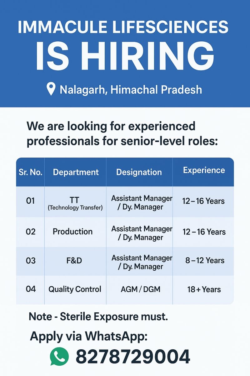 Immacule Lifesciences- Hiring For Technology Transfer, Production, F&D) and QC Dept Immacule Lifesciences- Hiring For Technology Transfer, Production, F&D) and QC Dept Post Views: 384 Job Category: Pharma Job Type: Full Time Job Location: Nalagarh Apply for this position Full Name *Email *Phone *Cover Letter *Upload CV/Resume *Allowed Type(s): .pdf, .doc, .docxBy using this form you agree with the storage and handling of your data by this website. *