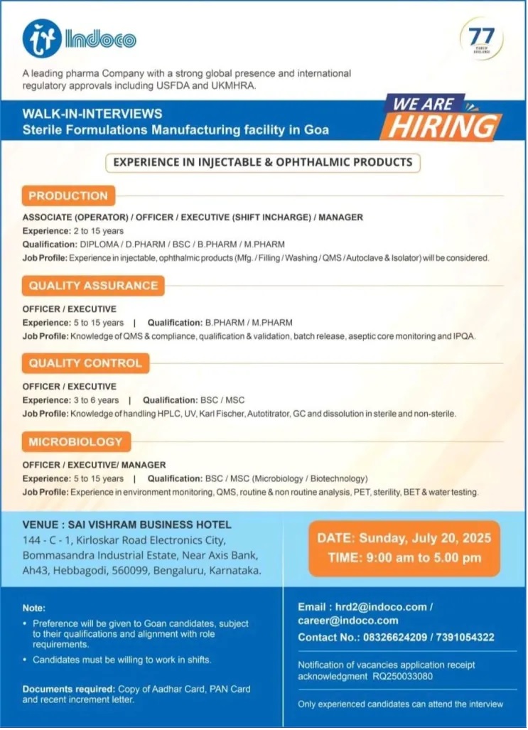 Indoco Pharma-Walk-In Interviews for Production, QA, QC & Microbiology on July 20, 2025