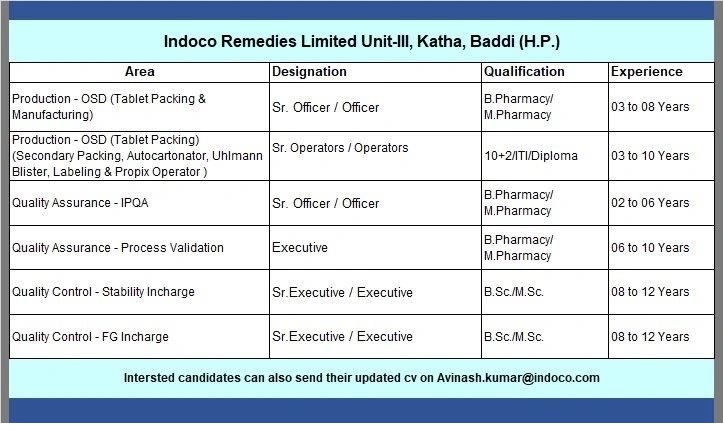 Indoco Remedies -Hiring Production, QA & QC Apply Indoco Remedies -Hiring Production, QA & QC Apply Interested candidates can send their updated CV to: [email protected] Post Views: 3 Job Category: Pharma Job Type: Full Time Job Location: Baddi Apply for this position Full Name *Email *Phone *Cover Letter *Upload CV/Resume *Allowed Type(s): .pdf, .doc, .docxBy using this form you agree with the storage and handling of your data by this website. *