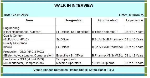 walk in interview on March 22, 2025 @ Indoco Remedies Limited (Unit-3), Baddi.