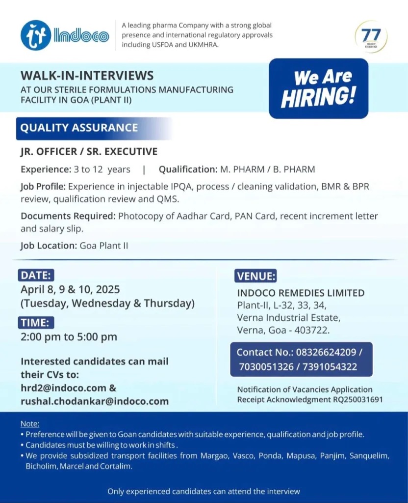 Indoco Remedies Limited – Walk-in Interviews for Quality Assurance Roles on April 8 to10th 2025@ Goa Plant II