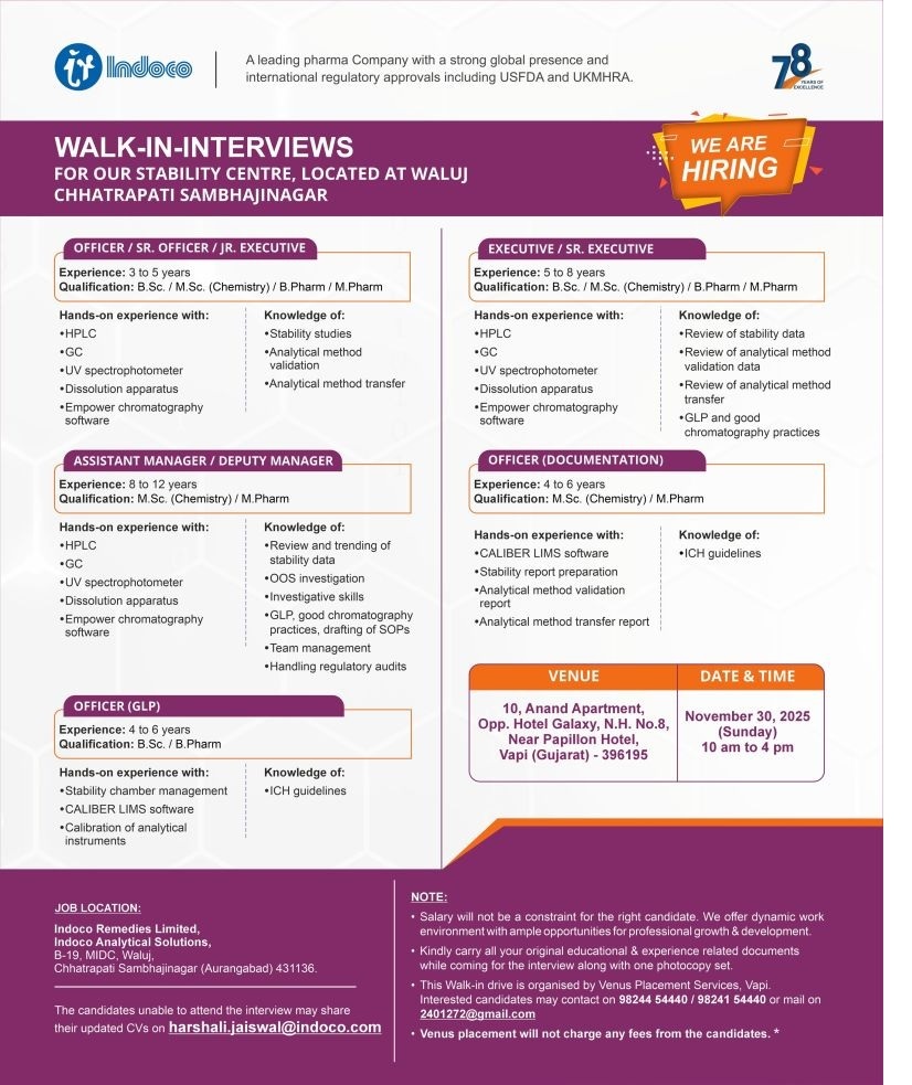 Job Location : Indoco Remedies Limited, Indoco Analytical Solutions, B-19, MIDC, Waluj, Chhatrapati Sambhajinagar (Aurangabad) 431136.