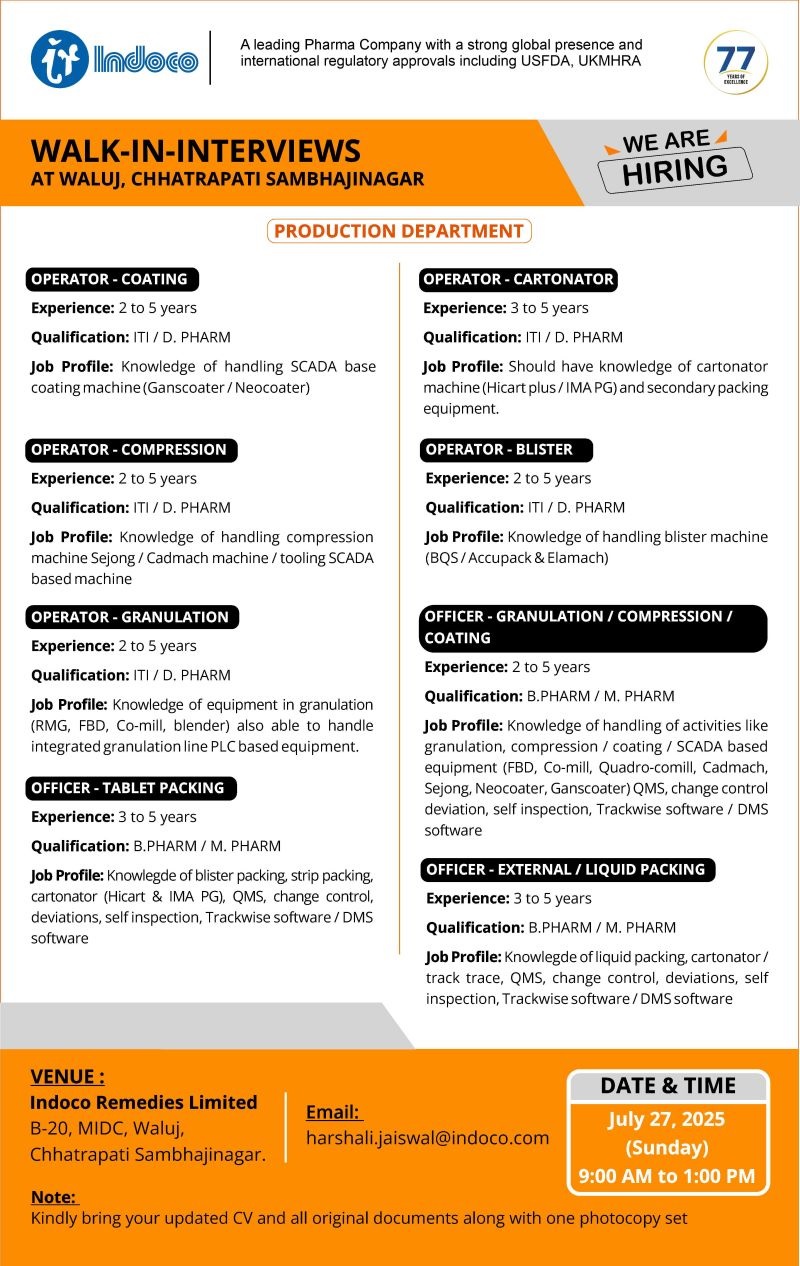 Indoco Remedies- Walk In Interview For Production on 27 July 2025