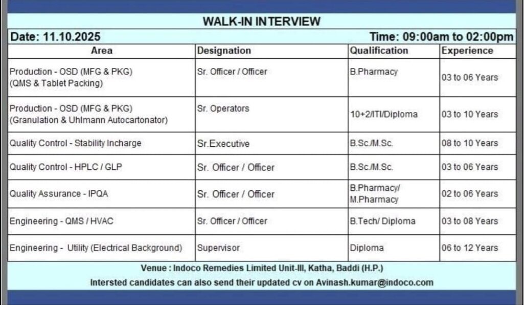 Indoco Remedies-Walk-In Interview for QA, QC, Production & Engineering on 11 Oct 2025 @Baddi