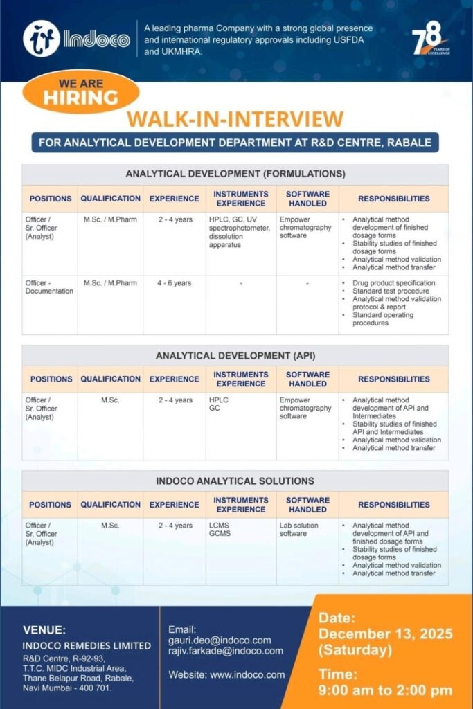 Indoco Remedies, a leading pharmaceutical company with strong global presence and regulatory approvals from USFDA and UKMHRA, is conducting a Walk-In Interview for multiple positions in the Analytical Development Department at its R&D Centre in Rabale.
