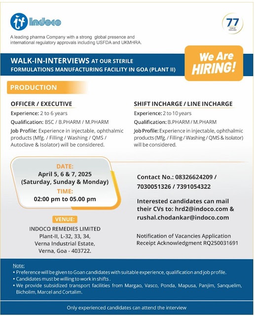 Indoco Remedies- Walk In Interview For Officer/ Executive/ Incharge Position on April 5, 6 & 7, 2025