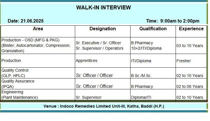 Indoco- Walk-in Interview For QC, QA, Production & Engineering on 21st June 2025 Indoco- Walk-in Interview For QC, QA, Production & Engineering on 21st June 2025 Post Views: 1,045 Job Category: Pharma Job Type: Full Time Job Location: Baddi Apply for this position Full Name *Email *Phone *Cover Letter *Upload CV/Resume *Allowed Type(s): .pdf, .doc, .docxBy using this form you agree with the storage and handling of your data by this website. *