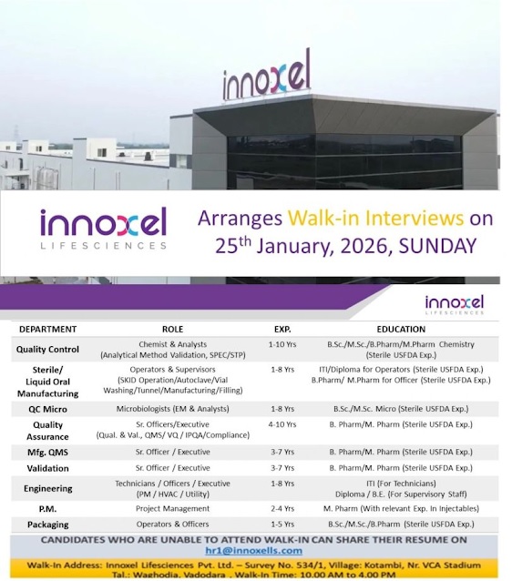 Walk-In Address : Innoxel Lifesciences Pvt. Ltd. – Survey No. 534/1,