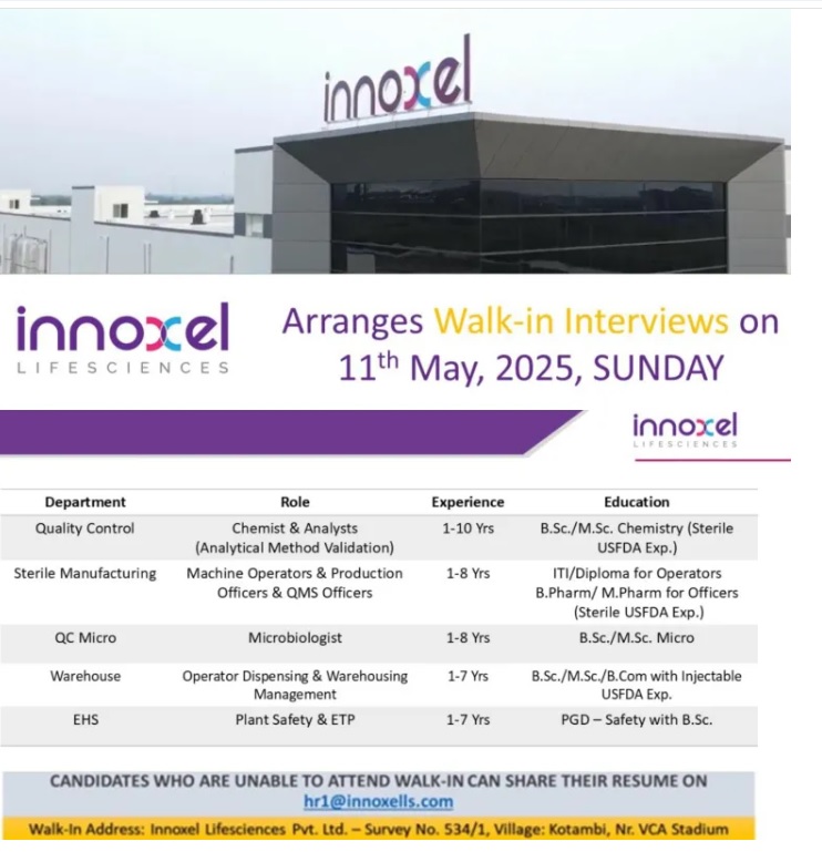 ! Venue: Innoxel Lifesciences Private Limited, Kotambi, Vadodara Site. CANDIDATES WHO ARE UNABLE TO ATTEND WALK-IN CAN SHARE THEIR RESUME ON [email protected]