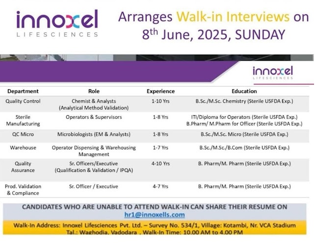 Innoxel Lifesciences- Walk-in Interview for Production, QA, QC, QC-Micro, Warehouse & Manufacturing on 08 June 2025 @Vadodara