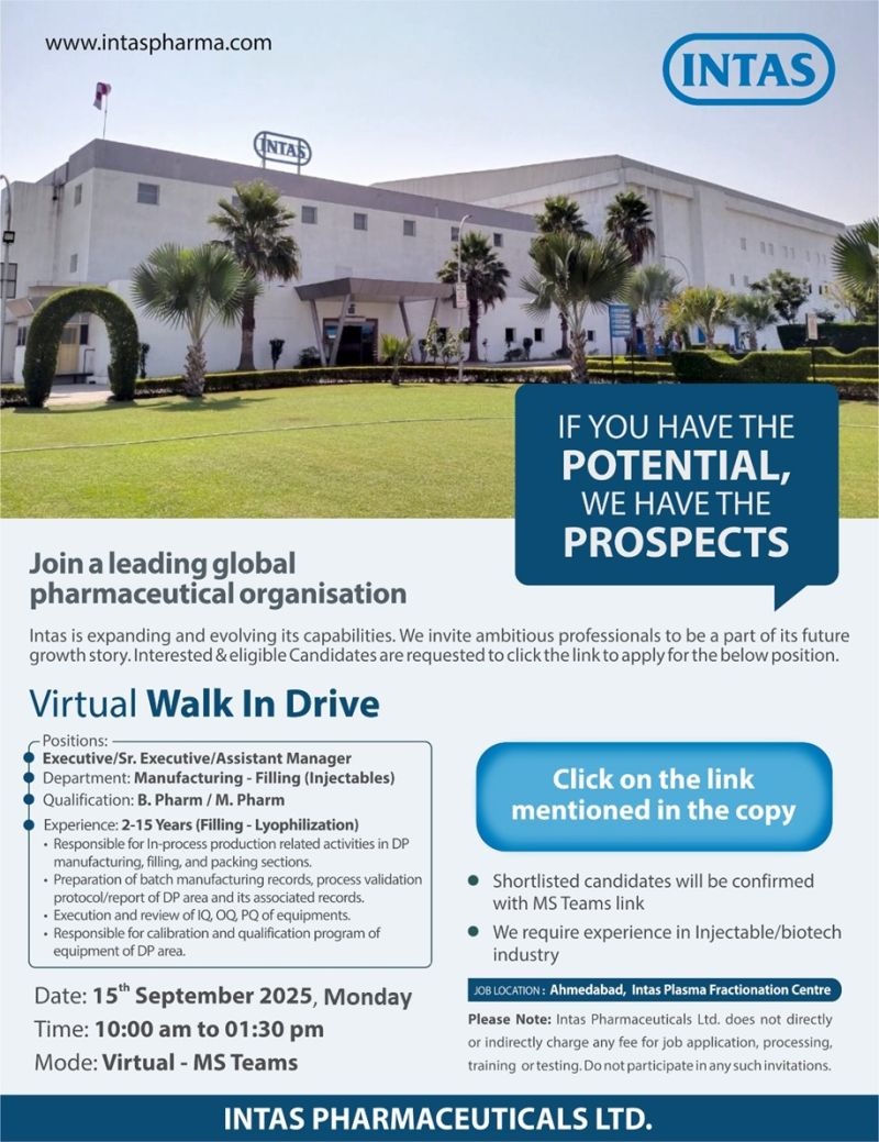 Job Location : Ahmedabad, Intas Plasma Fractionation Centre