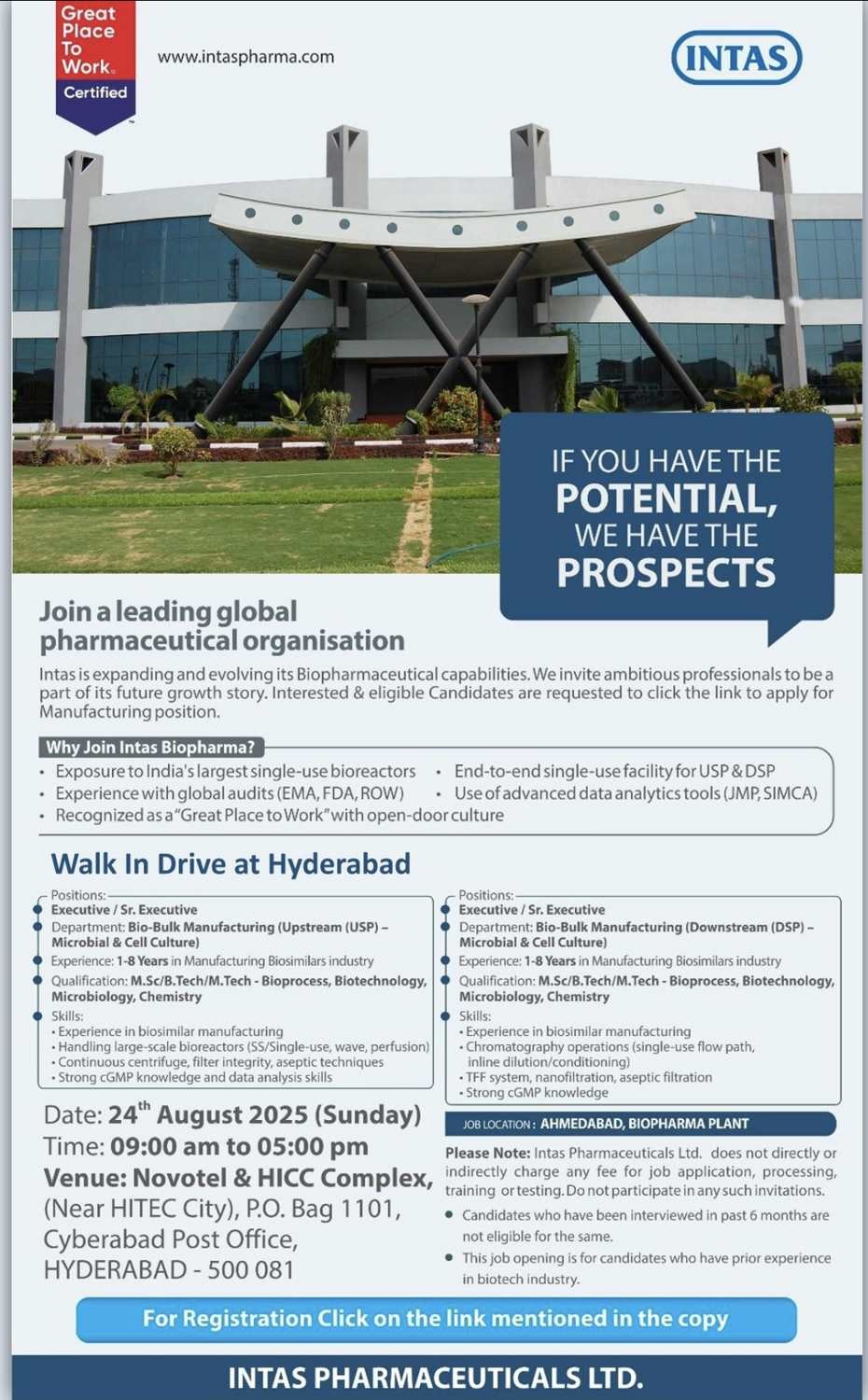 Intas Pharma-Walk in for Bio-Bulk Manufacturing Department on 24th August 2025@Hyderabad