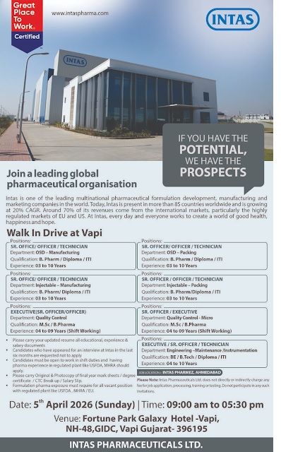 Intas Pharma-Walk in for Quality Control, Manufacturing, Packing on 5th April 2026