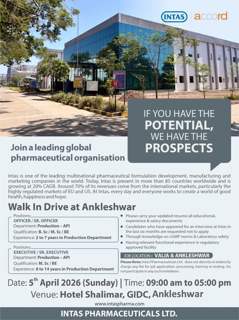 Intas Pharma- Walk In Drive For Production API on 5th April 2026